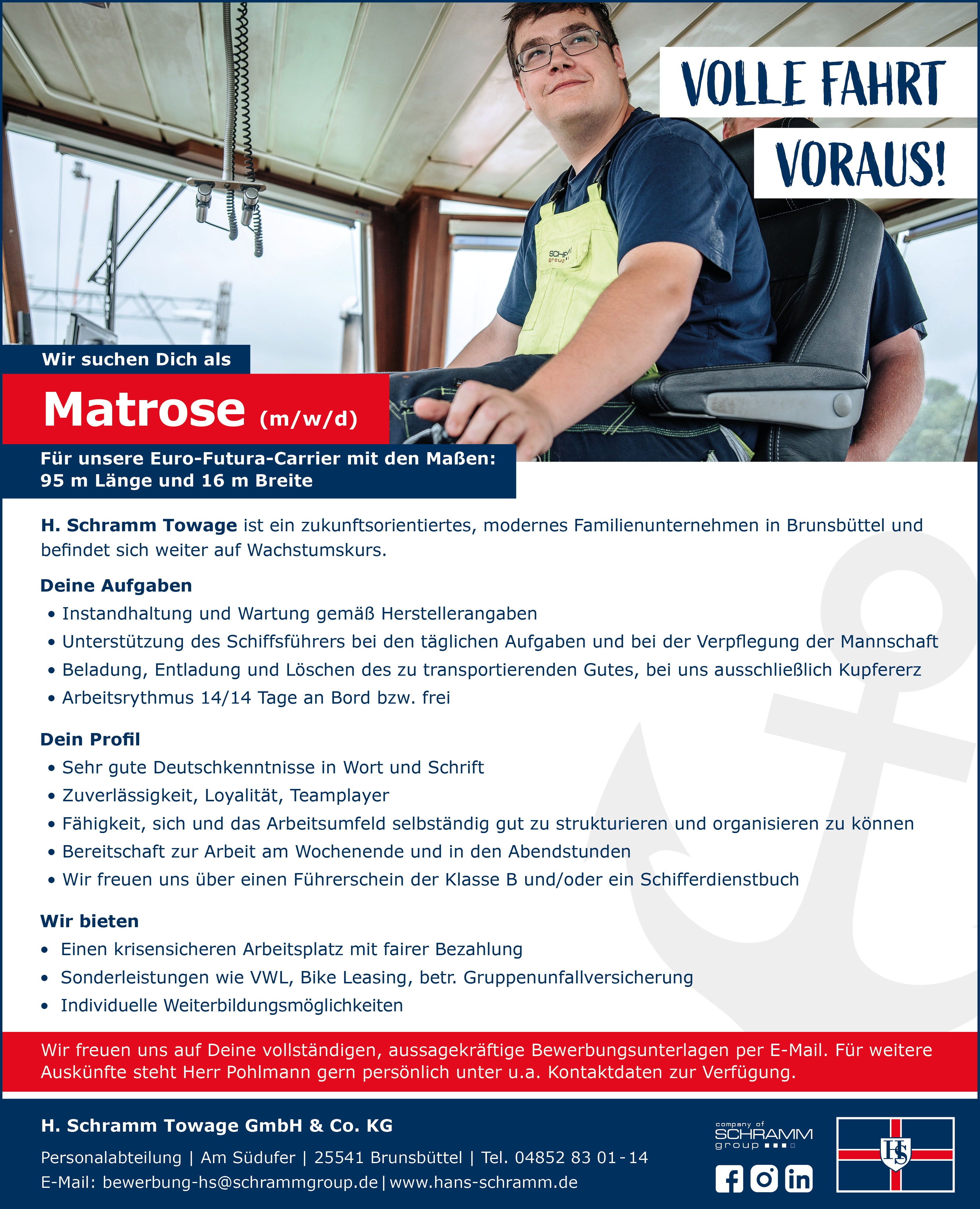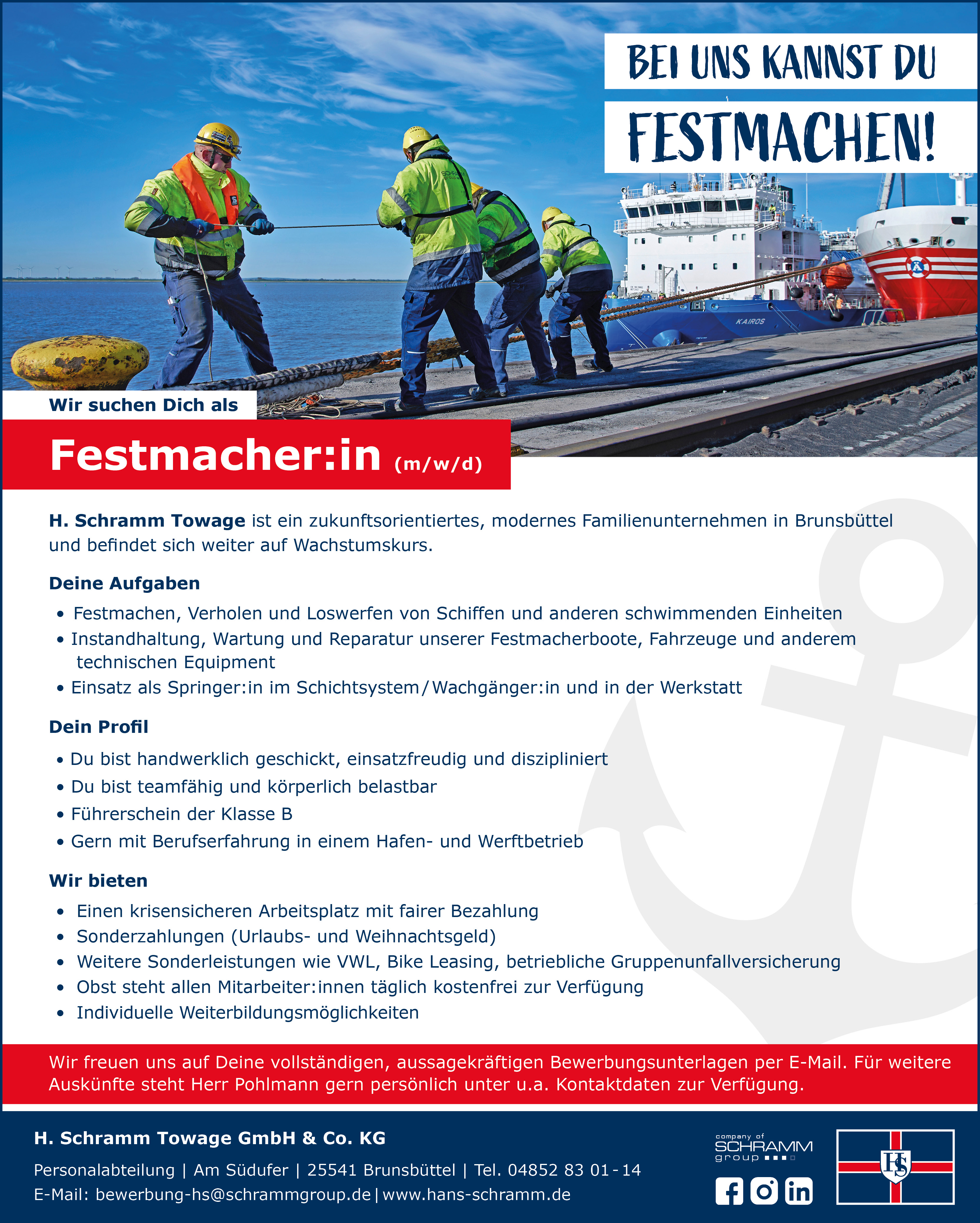Wir bieten dabei unterschiedliche Ausbildungen in zwei Ausbildungsbetrieben: Erlebe die vielfältige Hafenwelt bei Brunsbüttel Ports, oder schnuppere echte Seeluft im Bereich der Reederei bei H. Schramm Towage.